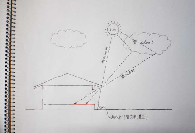 私の家は、建物を真南に向けて配置し、軒の出は約1mあるため夏の日差しが室内に入ることはありません。横浜の夏至・南中の太陽高度は約78度です。下図にあるとおり、この太陽光(直達日射)が室内に入らないように、軒の出の寸法などを決定します。
